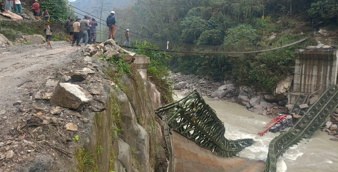 इटहरी। सङ्खुवासभाको मकालु गाउँपालिका वडा नं. ५ र वडा नं. २ जोड्ने बेलिब्रिज भाँचिएको छ भने ट्रक अरुण नदीमा खसेको छ।शनिबार मकालु-५ को नुम र वडा नं. २ को सेदुवा जोड्ने अरुण नदीमा निर्माण गरिएको बेलिब्रिज भाँचिएको हो। सिमेन्ट बोकेको ट्रक तार्ने क्रममा बेलिब्रिज भाँचिएको जिल्ला प्रहरी कार्यालय, सङ्खुवासभाका प्रहरी नायब उपरीक्षक कुमारप्रसाद मैनालीले बताए।